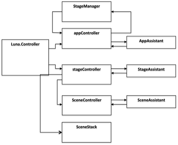 A diagram showing the relationship between these objects is shown in the figure below, and includes a couple of additional objects that support the controllers. StageManager is an object that works cooperatively with the AppController to manage the active stages. Similarly, SceneStack works with the StageController to provide methods for managing the scene stack but you will not access its methods directly; rather access is through the StageController methods.