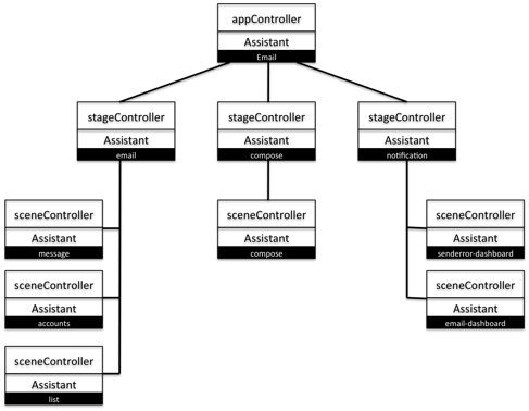 To illustrate this, let's go back to the Email application. It has multiple stages: one to handle the dashboard along with the card stage and compose stages, and there are multiple scenes. A subset of the complete application hierarchy is shown below: there is a single appController, three stageControllers (List, Compose and Notification), and each stageController has one or more SceneAssistants that it may use.