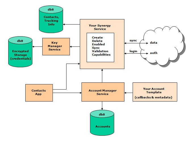 Typically, a Synergy connector (contacts, calendar, email, etc.) creates a Synergy JavaScript service that connects to an outside data source for login and syncing. In addition, the service manages the caching of credentials and configuration data on the device. An account object on the device, in this case, serves as a proxy for a real provider account, such as one on Facebook, Google, or Linked-in. The Synergy service provides an account template containing, besides metadata, callbacks the Account Manager invokes when creating, deleting or modifying one of its account objects. The Synergy service also provides a callback to implement syncing with an outside data source.